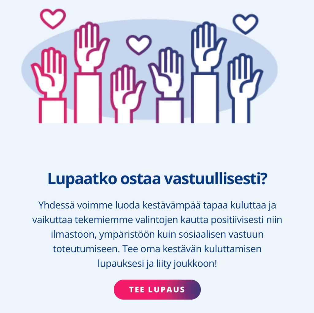 Lupaan ostaa vastuullisesti -kampanja herättelee ihmisiä tarkastelemaan suhdettaan kuluttamiseen ja kannustaa tekemään henkilökohtaisen kestävämmän kuluttamisen lupauksen. Lupauksen voi tehdä allekirjoittamalla lomakkeen Ostavastuullisesti.fi-sivustolla, jolloin jokainen samaistuttava pieni tai suuri lupaus inspiroi muita.